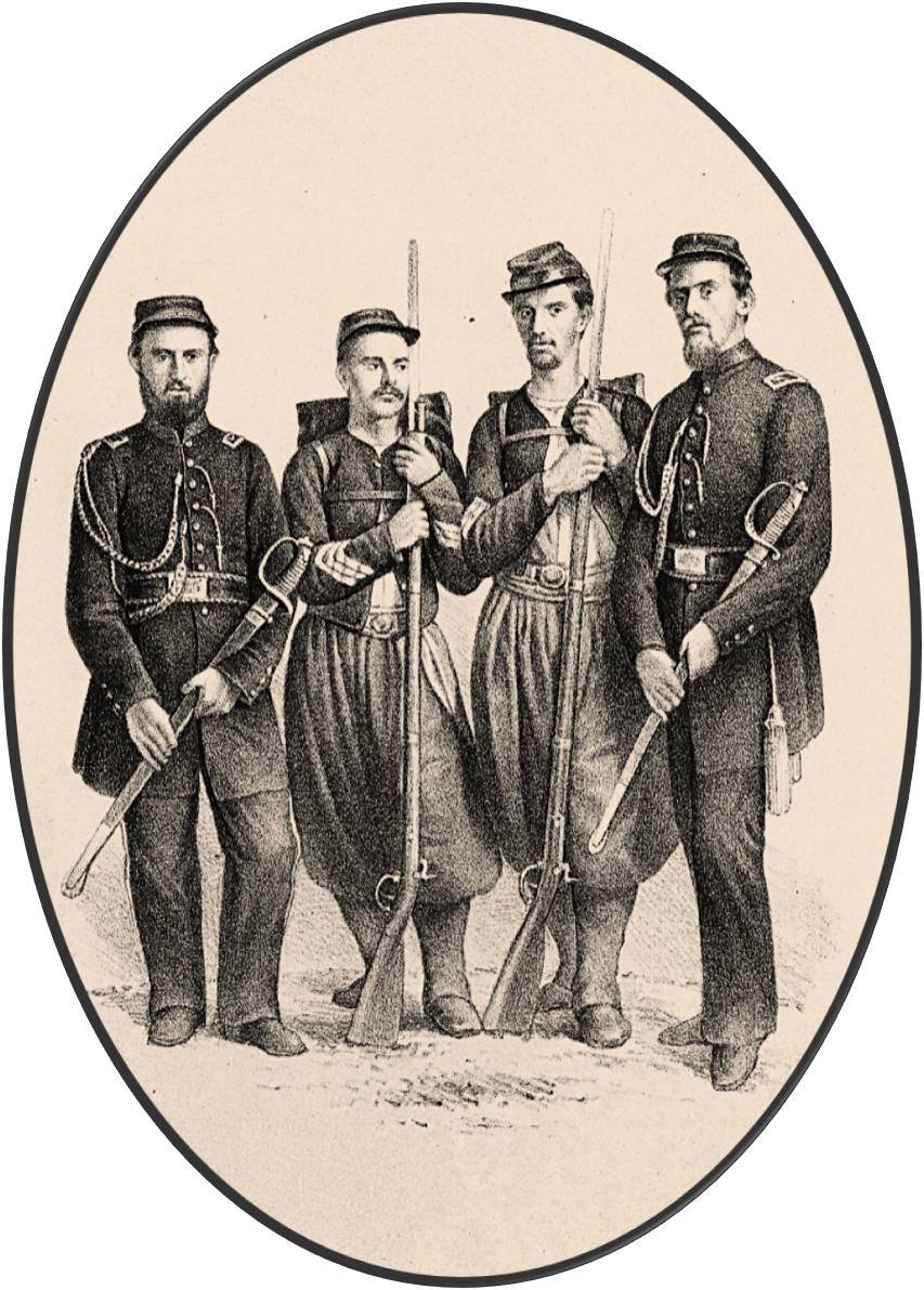 The officers appear dressed in the standard officers' uniform of dark blue frock coat, dark blue trousers with officers' stripe, kepi and the addition of shoulder aiguillettes. The enlisted men wear leggings with baggy trousers, sash with belt and circular spoon buckle, a vest with a large solid running down the center and a Zouave cut jacket and topped off with a kepi.