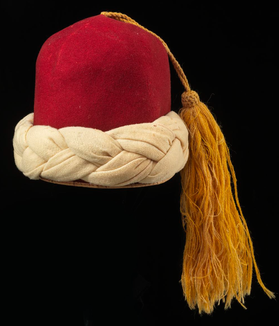 A red fez with yellow tassel was adopted, around which was worn a flannel turban of either solid white, or white with medium blue stripes. |