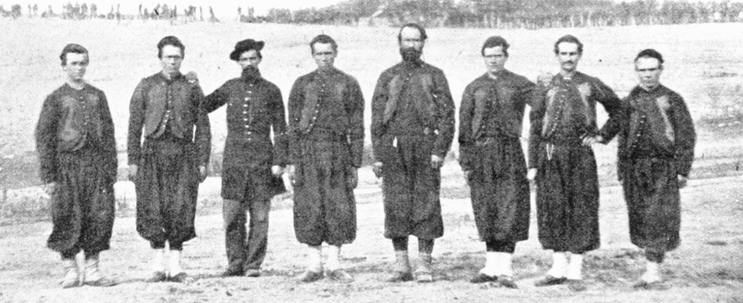 Squad of Company C in Camp at Peeble's Farm, Virginia, ca. 1864.Right to Left - Corporal A.N. Euwer, Alex Jamison, Augustus Snyder, Charles Murdock, Corporal Thomas Montgomery, James Lowry, Sergeant Joseph M. Cargo and James Parker. (Source - "Under the Maltese Cross")