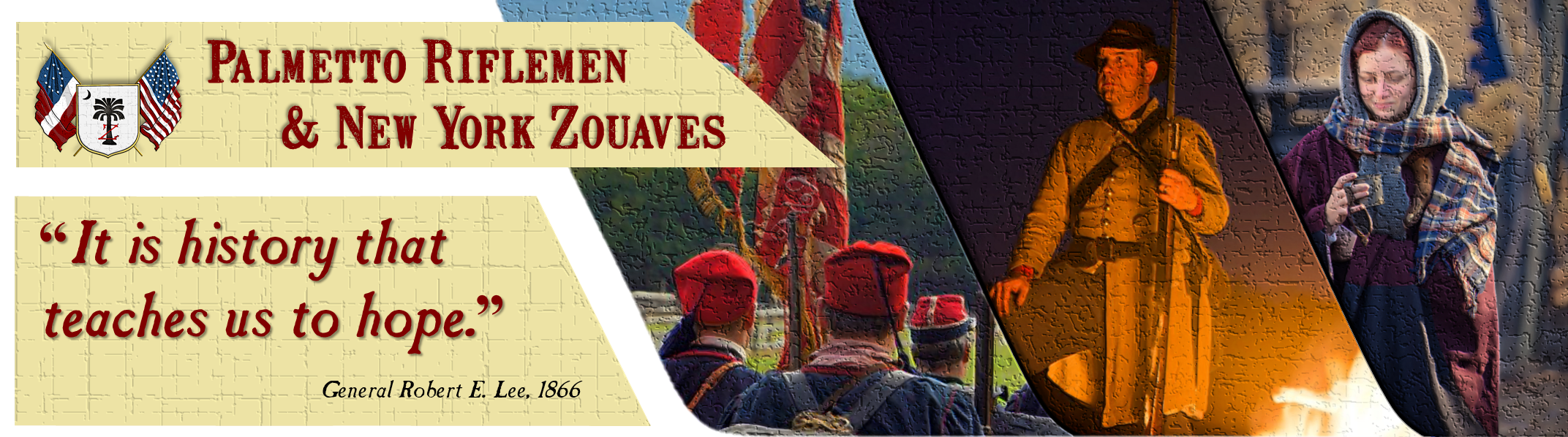 The "Palmetto Riflemen & New York Zouaves" is an American Civil War Reenacting & Living History organization founded in November 2002 for the purpose of preserving the memory of the services and experiences of the everyday soldiers and civilians of the American Civil War era, 1860 to 1865. The Company Headquarters are centrally located in Lexington, South Carolina, with members coming together from across South Carolina, Georgia & North Carolina.