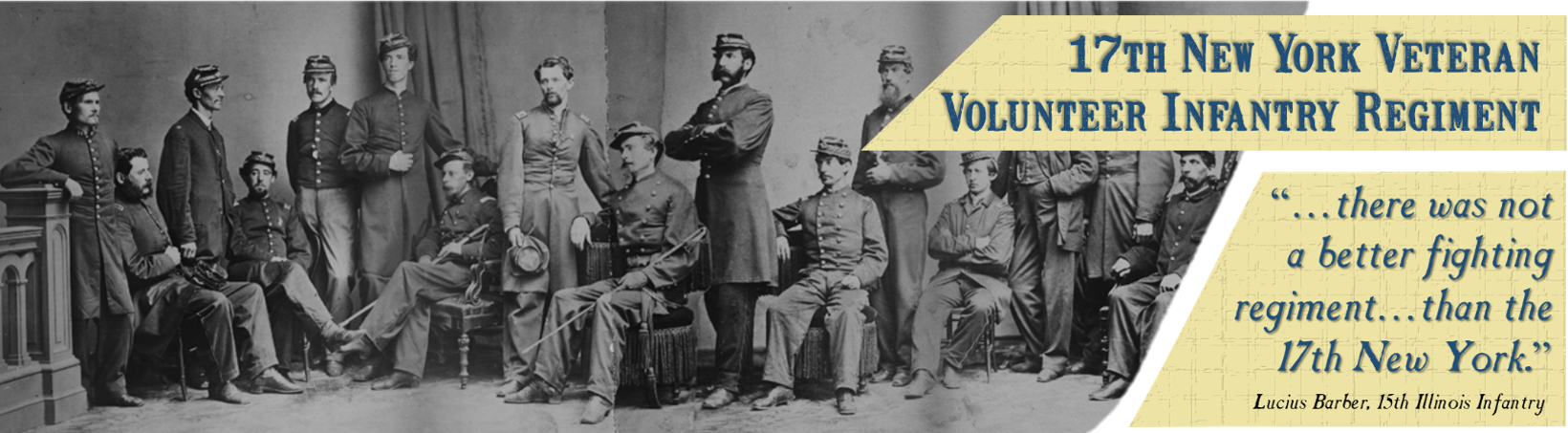 The following historical information is about the service of both the regiment, and the men, of the Seventeenth (17th) New York Veteran Volunteer Infantry Regiment, which served in the American Civil War from June 2nd, 1863, to July 13th, 1865. If you have any corrections, suggestions, or additional information, photographs, artifacts, etc., that you wish to contribute, feel free to submit the information to the Webmaster.