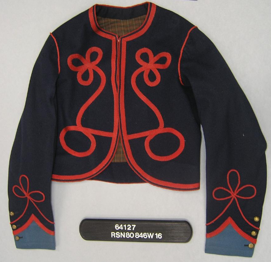 Underneath the jacket was worn the standard Zouave style vest of dark blue, with a single row of piping down the front and around the collar, which was buttoned on the side and over the shoulder.