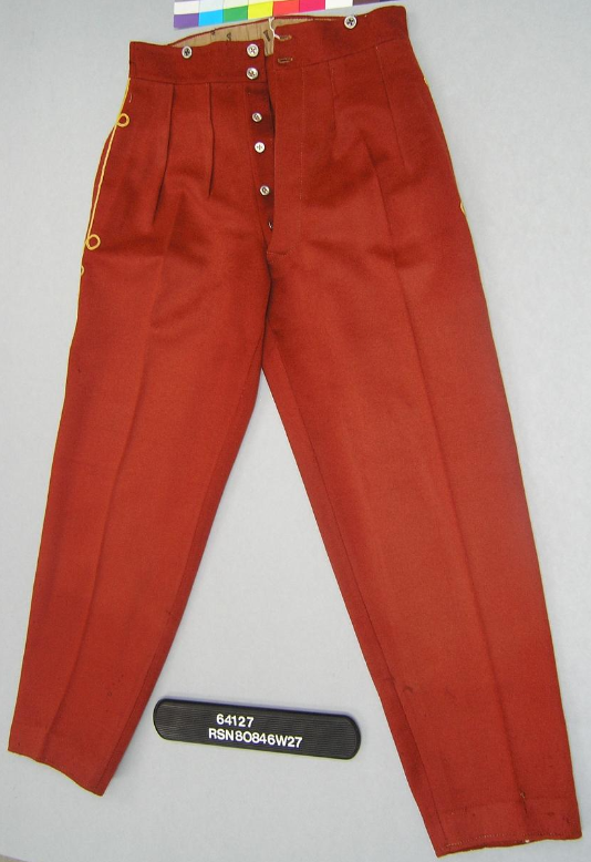 The trousers were of a chasseur cut, and made of a 'madder' red color, with yellow soutache (trim) around the pockets; although there area examples of these trousers without the soutache.