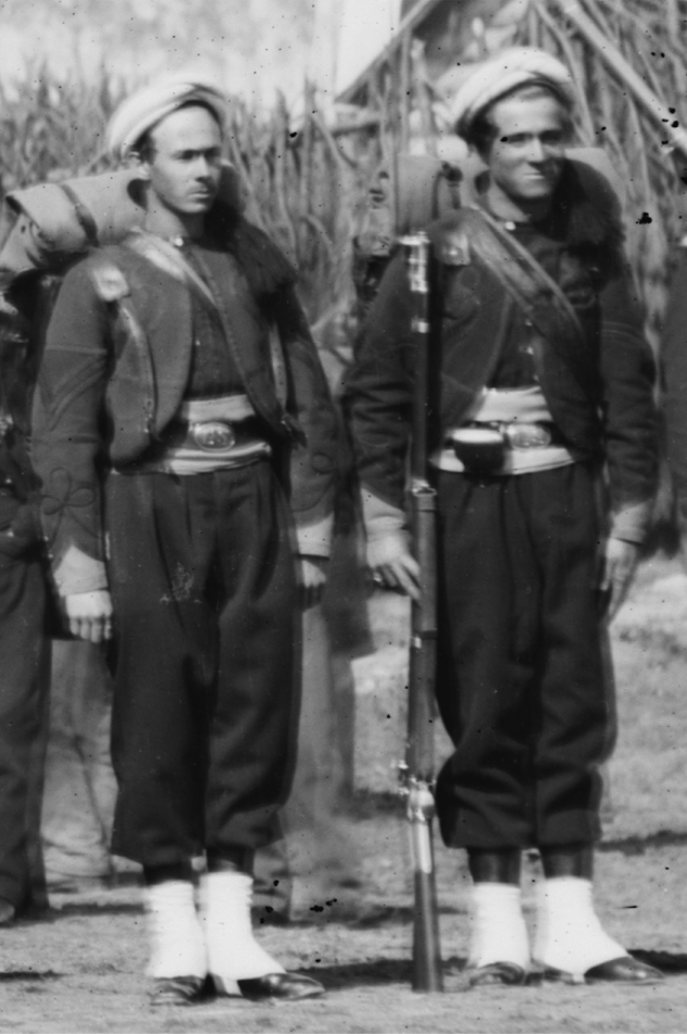 A red fez with yellow tassel was adopted, around which was worn a flannel turban of either solid white, or white with medium blue stripes. |