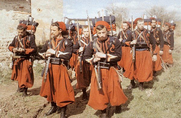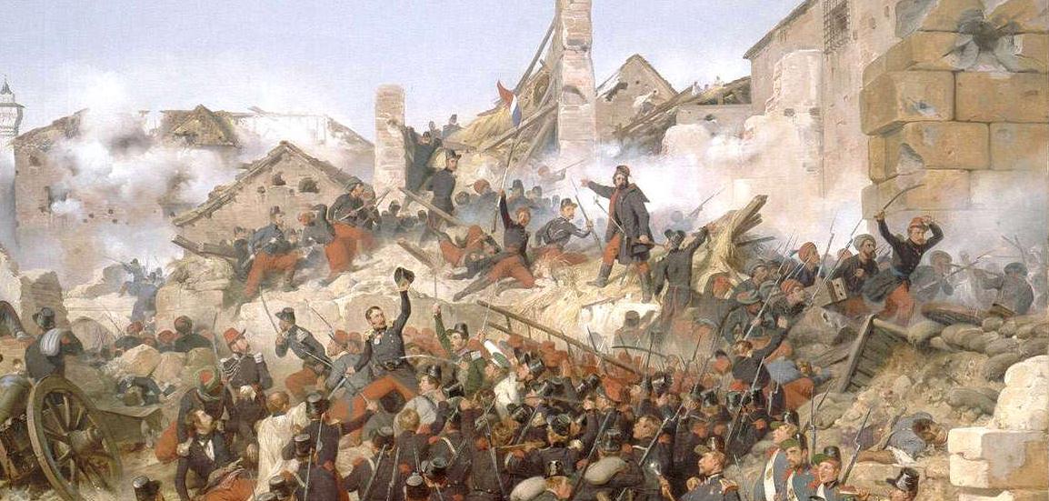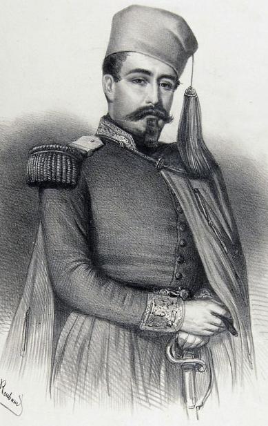 A section of the painting "La prise de Constantine, 1837" by Horace Vernet, showing the Zouaves & Lamoriciere at Constantine."To form some notion of those troops, among whom the Zouaves showed themselves like the gods in the war of Troy, one anecdote will suffice, chosen from many which prove the valor of the army my generally. The rear-guard at Mansourah was under the command of Changarnier; it was reduced to three hundred men; he halted this little troop and said, "Come, my men, look these fellows in the face; they are six thousand, you are three hundred; surely the match is even." This speech was sufficient. The Frenchmen awaited the onset till the enemy was within pistol-shot; then, after a murderous volley, they charged on the Arabs, who broke and fled in dismay. During the remainder of the day they would not approach this band nearer than long rifle range. "The siege of Constantine may properly be said to have ended the war of occupation in Africa. Hitherto we have seen the Zouaves only in time of active war, or in the defense of hill-forts, obliged to unity through fear of an ever-menacing foe, and laboring for their own preservation or comfort only; but now commenced a new training for them, no less severe and dangerous, in which they showed themselves equally willing and competent, - a war against stubborn nature in all her most forbidding aspects. Under the blazing suns of that tropical climate they recommenced at Coleah the work already begun at Dely Ibrahim; ditches were to be dug, works thrown up, roads made, draining accomplished, farms tended, all that was necessary for the establishment of those permanent colonies which France was so anxious to settle in Algeria was to be done by the Zouaves; yet, despite that terrible labor, the danger and hardship, the sickness and death, the ranks of the regiment filled up rapidly; and, joined by the wrecks of the battalion of Mechouar, they were kept full to overflowing. This battalion of Mechouar was a troop left by Clausel in the mechouar, or citadel, of Tlemcen, in the West of Oran, under the command of Captain Louis-Eugene Cavaignac; on the conclusion of the war, in 1837, they, of course, returned to their regiment at Coleah. "This deceitful peace lasted only till 1839. In this year the vigilant colonel of Zouaves perceived in his native troops alarming symptoms of mutiny, and learned, to his surprise, that they were in a ripe condition for revolt. Wild Santons of the desert, emissaries, doubtless, of Abd-el-Kader, held secret meetings near the camp; many soldiers attended them, and were seduced by artfully prepared inflammatory harangues and prophecies. In the month of December 1839, at the raising of the standard of Islam, the natives flocked in vast numbers to rid the land of the Christians; and most of the native Zouaves deserted to join the fortunes of the prince whom they reverenced as a prophet. Old soldiers, trained in the French service to a thorough acquaintance with European tactics, and gray with battling long for Lamoriciere, suddenly left him, and by their knowledge of the art of war gave great advantage to the Arab force. In their combats with the Sultan, the Zouaves not infrequently found that a sharp resistance or a masterly retreat on the part of the enemy was executed under the direction of one of their former comrades in arms. It was a critical moment for the Zouaves; but at the announcement of the renewal of hostilities volunteers flowed in on all sides, whether of young men full of ardor and excitement, or, as in many instances, of old soldiers who had already served their time. After a winter of petty skirmishing and reestablishing in Algeria the semblance of security, the Duke of Orleans led the army, considerably reinforced, in a raid against the Arabs under Abd-el-Kader in their own territory. The Zouaves accompanied this expedition, and whether in their charges against the mountaineers, who, with the aid of the Arab regulars, defended each pass, or sustaining the shock of the provincial cavalry, or even standing unmoved before the attack of Abd-el-Kader's terrible "Reds," (The mounted body-guard of Abd-el-Kader, so called by the French from their complete red uniform.) they maintained their character of rapid, intrepid, and successful soldiers. What names we find in this regiment! Lamoriciere, Regnault, Renault, (now General of Division,) Cavaignac, Leflo, (now General of Brigade,) and St. Arnaud, who died Marshal of France two days after the victory of the Alma. "A singular instance of the handiness of the Zouaves is found in the notice of their forced march on this campaign, undertaken May 20th, to support the retreating Seventeenth Light Infantry. Their cartridges were fired away, the regulars of Abd-el-Kader were upon them, and nothing seemed to remain but an heroic death, when, "Comrades," cried one, "see, here are stones!" Not a word more; each caught the hint, and, with simultaneous volleys of stones, drove off the charging enemy, and broke their way to where the remains of the Seventeenth rallied under Colonel Bedeau, after a retreat more properly to be called a continual attack! "Hard at work during the winter of 1840-41, General Thomas Robert Bugeaud found these indefatigable soldiers in perfect condition to take the field again, when he landed in April. There had been sharp fighting during the past year at Mouzaia, in which the Zouaves always led the van, and were, as in every engagement they ever fought, covered with honor. "The Second, electrified by the example of its officers, and led by Colonel Changarnier, flung itself on the entrenchments; the redoubts were carried, etc. At the same time, in the other column, Lamoriciere led the way with his Zouaves, followed by the other troops. The Zouaves surmounted the almost impassable cliffs, attacked and carried two lines of entrenchments, and, in the teeth of a murderous fire, forced a third; a few moments later the two columns joined, and, rush